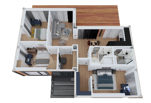 Модель ULTRA 88 — это достаточно просторный дом общей площадью 88 кв. м. Он отличается лаконичной и удобной планировкой помещений, продуманной для большой семьи. В доме предусмотрено расположение большой гостиной, совмещенной с кухней, три спальные комнаты, два санузла и гардероб. Нестандартная архитектура — со смещением модулей, подчеркивает современный дизайн здания, а кроме того, позволяет организовать красивую входную группу с крыльцом и уютную террасу. Благодаря применению стройматериалов с минимальными показателями теплопроводности, дом идеально подходит для постоянного проживания, а для его отопления не потребуются большие энергозатраты.